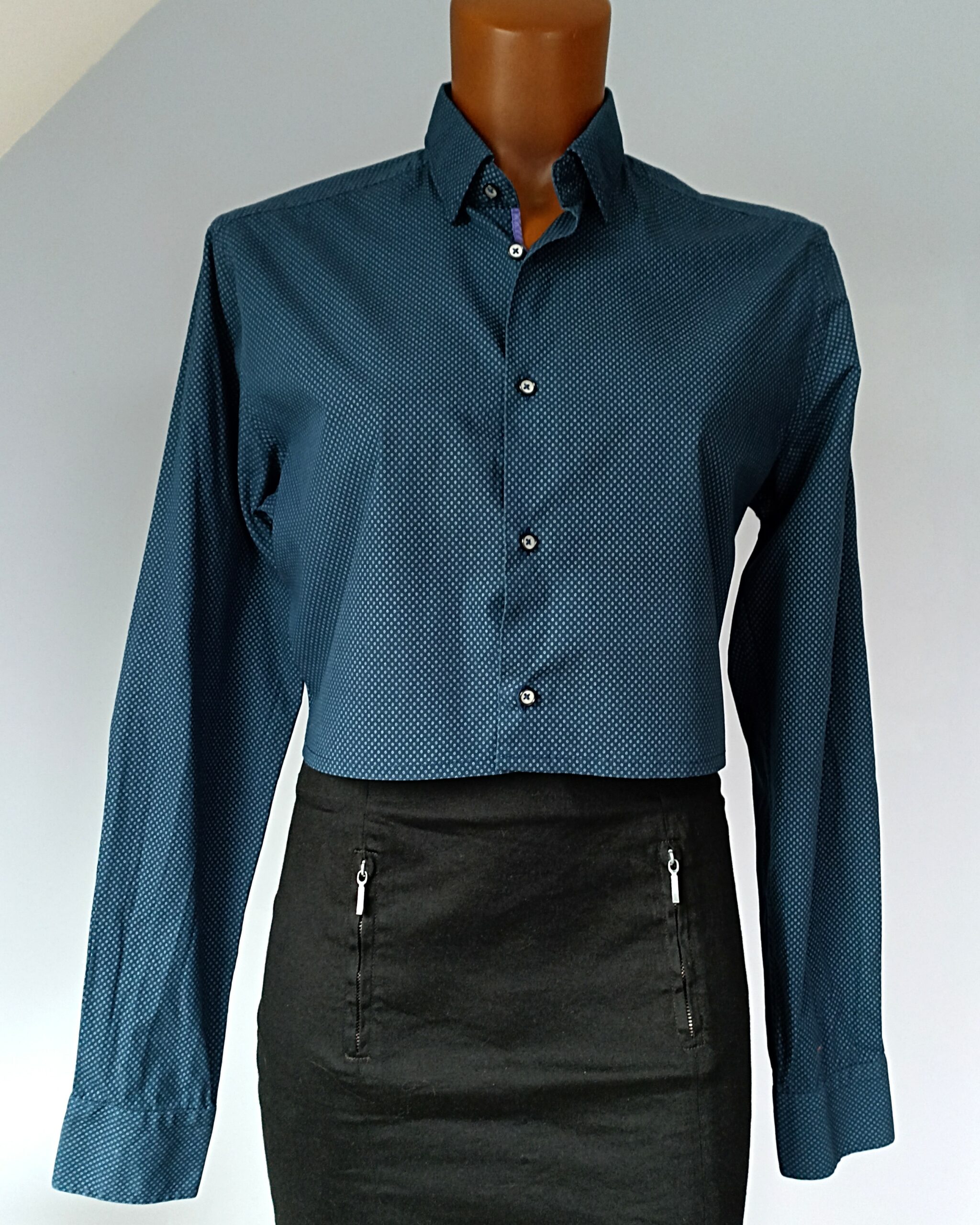 Confectionnée à partir d’une chemise de seconde main soigneusement sélectionnée, elle incarne une mode créative et responsable.