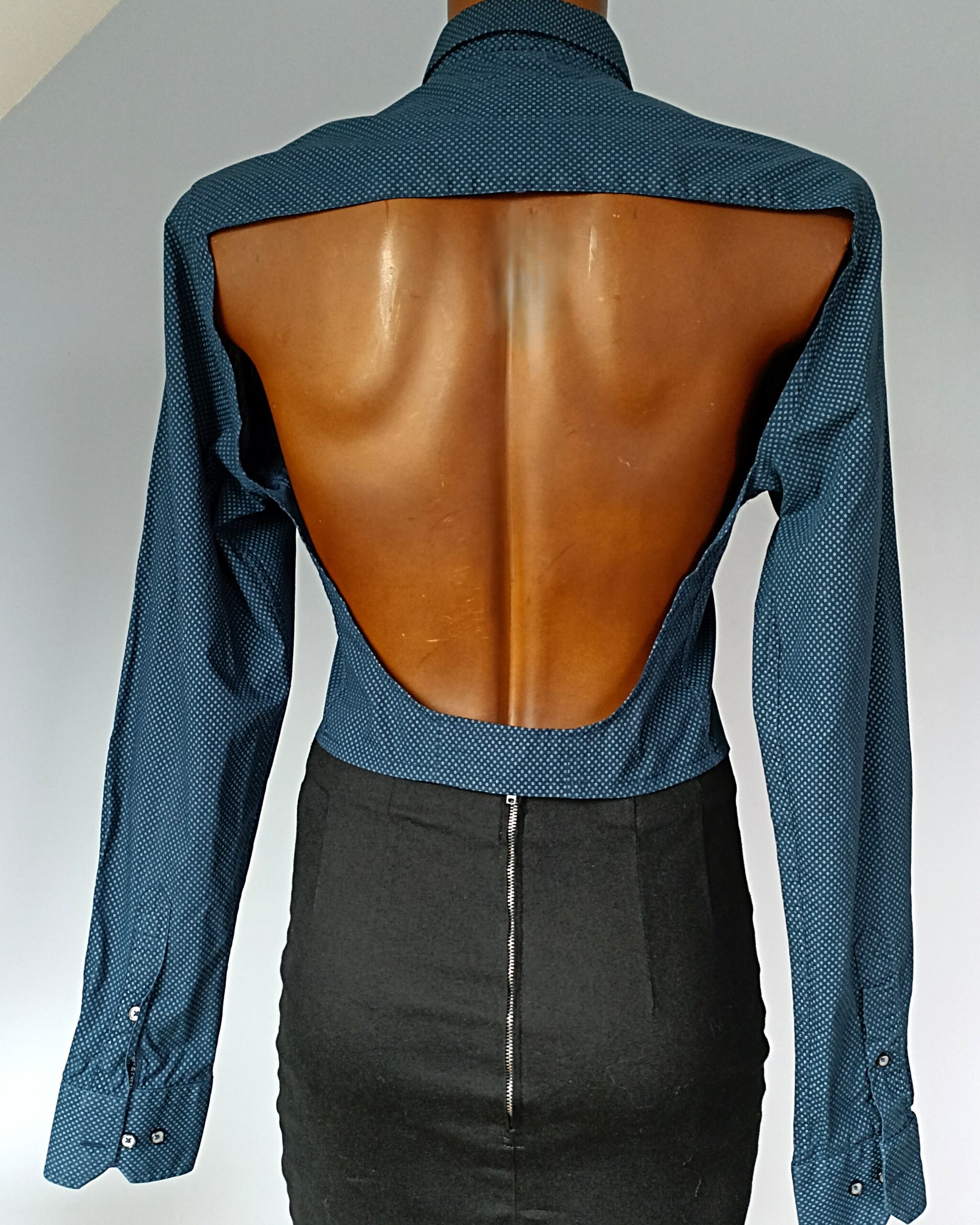 Son dos entièrement ouvert dévoile la silhouette avec subtilité et féminité, créant un contraste élégant entre la rigueur de la chemise et la sensualité du dos nu. Chaque modèle est unique, transformé à la main, ce qui en fait une pièce exclusive que vous ne trouverez nulle part ailleurs.