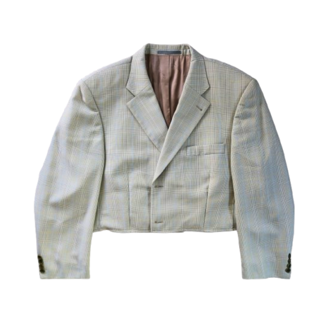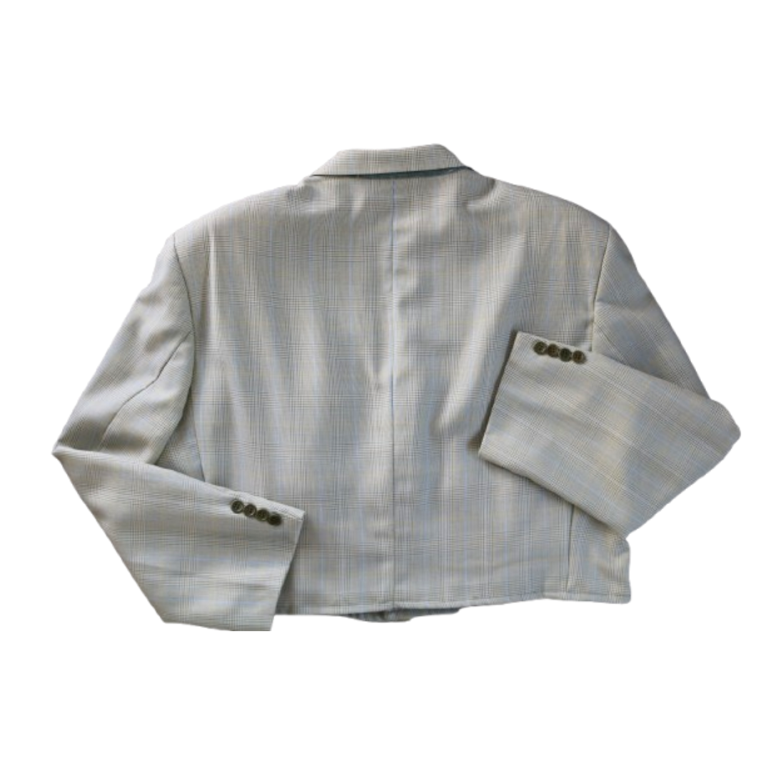 La veste courte aux épaules larges et ajustée à la taille apporte structure et style. Associée à la jupe assortie, elle crée une tenue harmonieuse, originale et féminine.