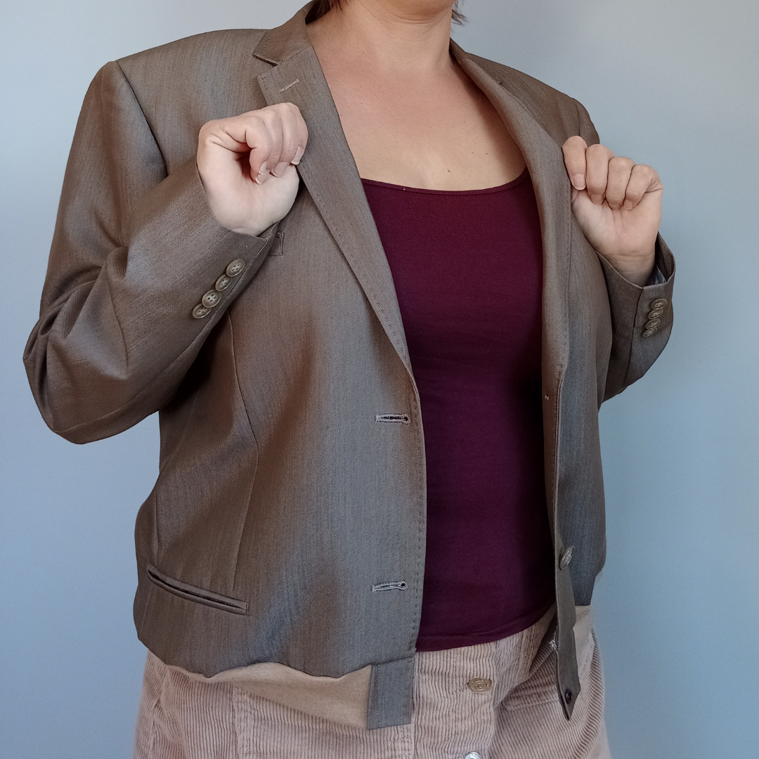 Adoptez un look tendance avec cette veste femme à la coupe mixte, mixant allure classique et finition en bord côte à la taille. Réalisée à partir d’une veste de costume upcyclée, cette veste originale adopte une nouvelle coupe d’inspiration bombers.